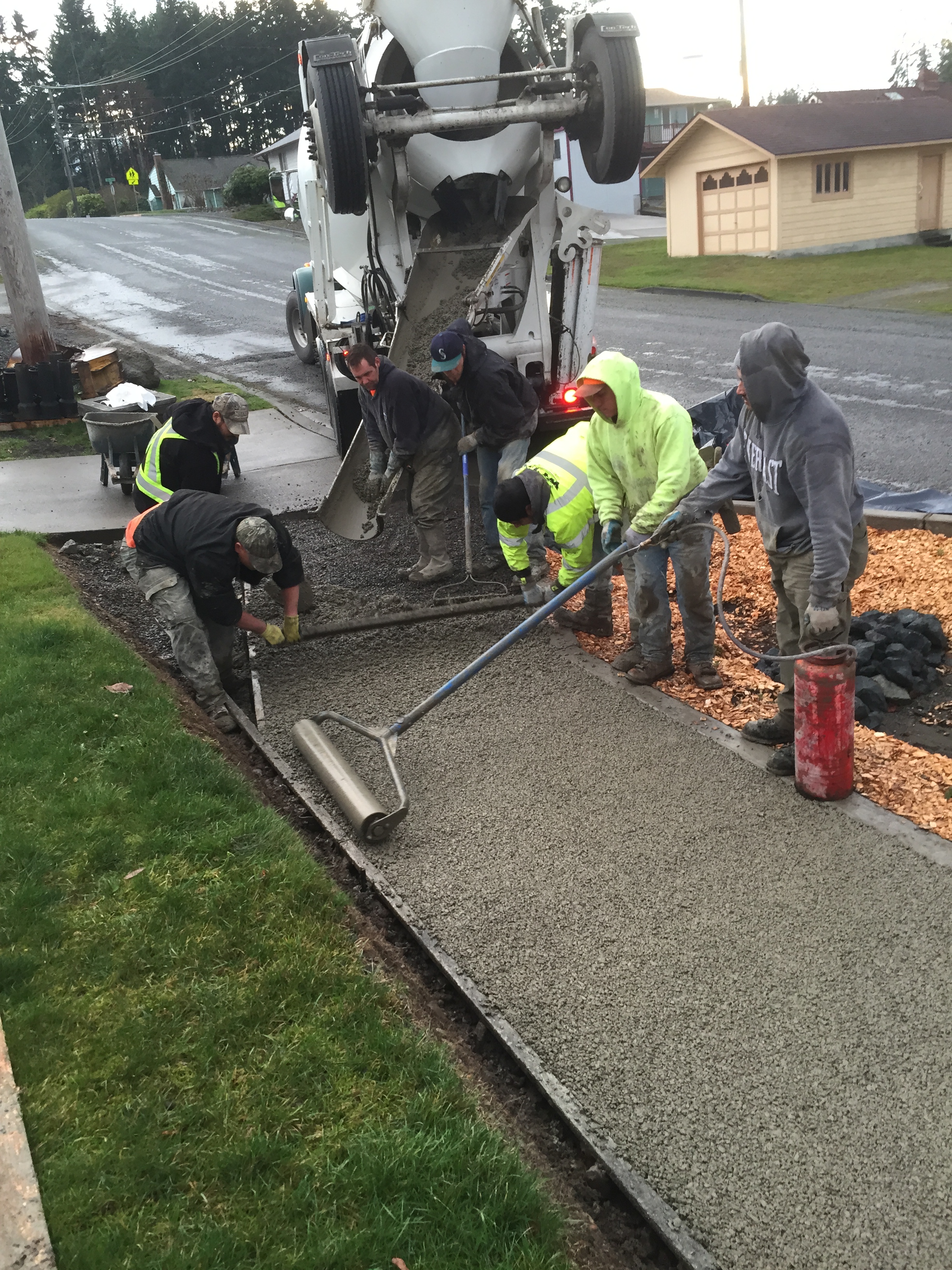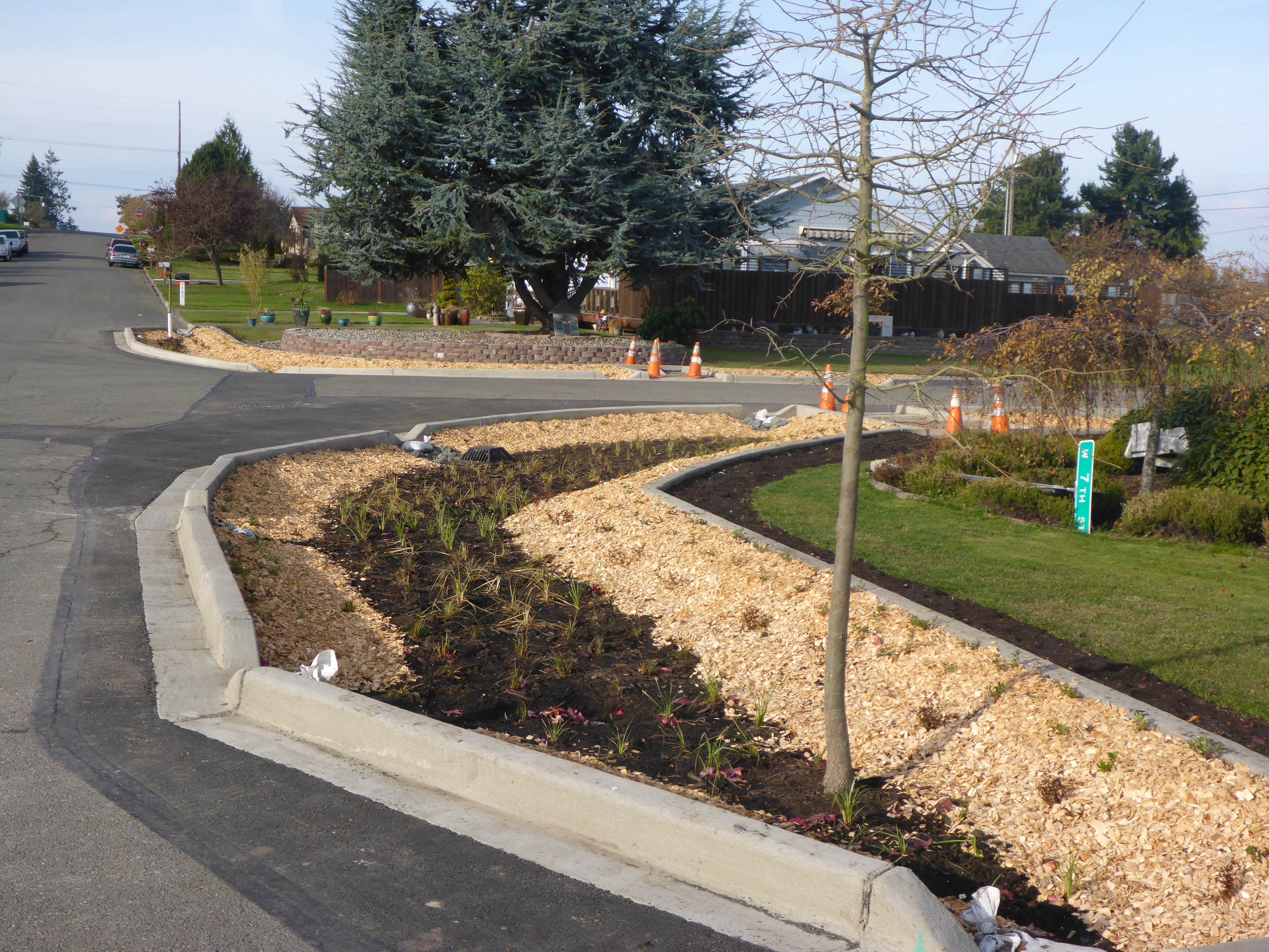 Pervious concrete has been installed that allows water to run through the concrete and soak into the ground.